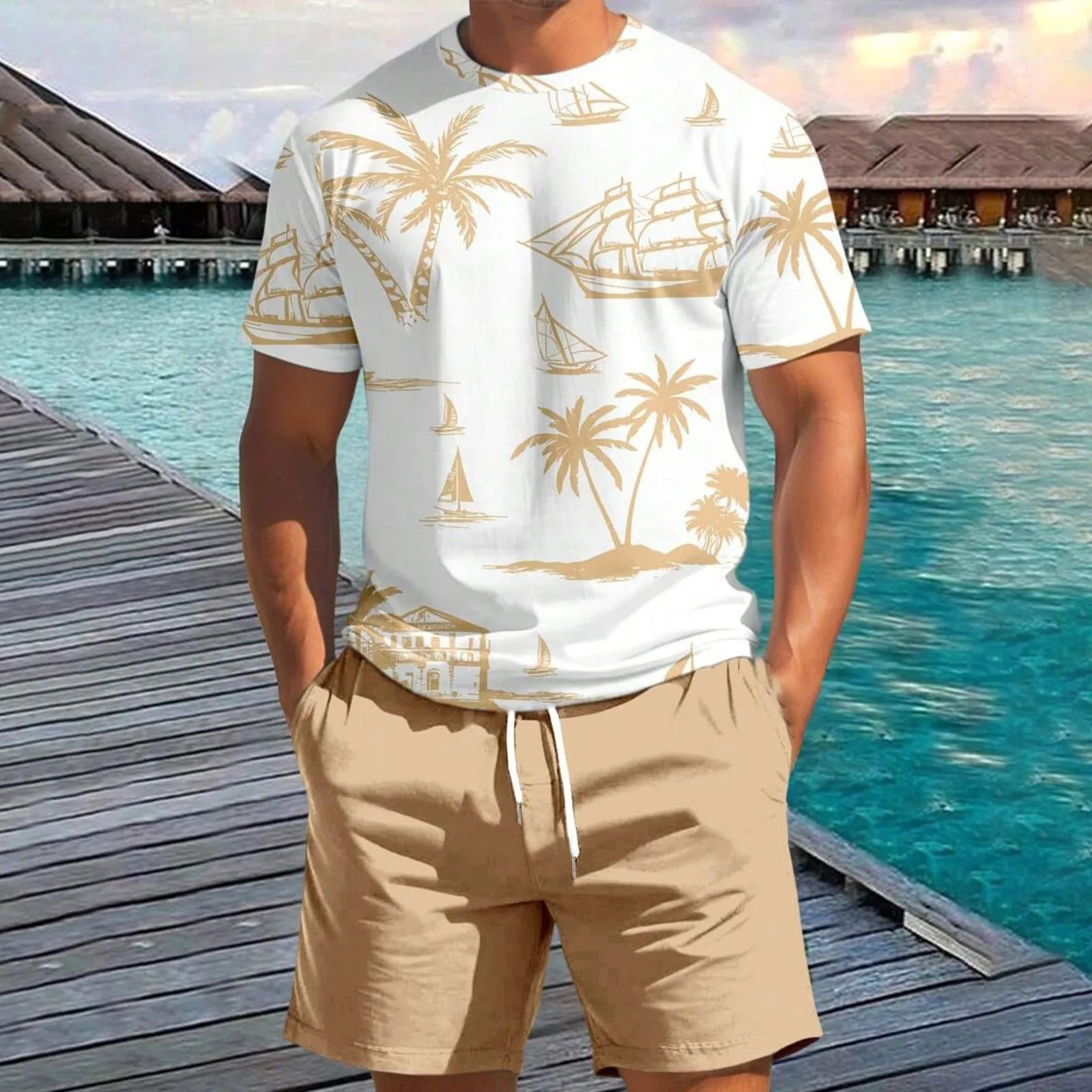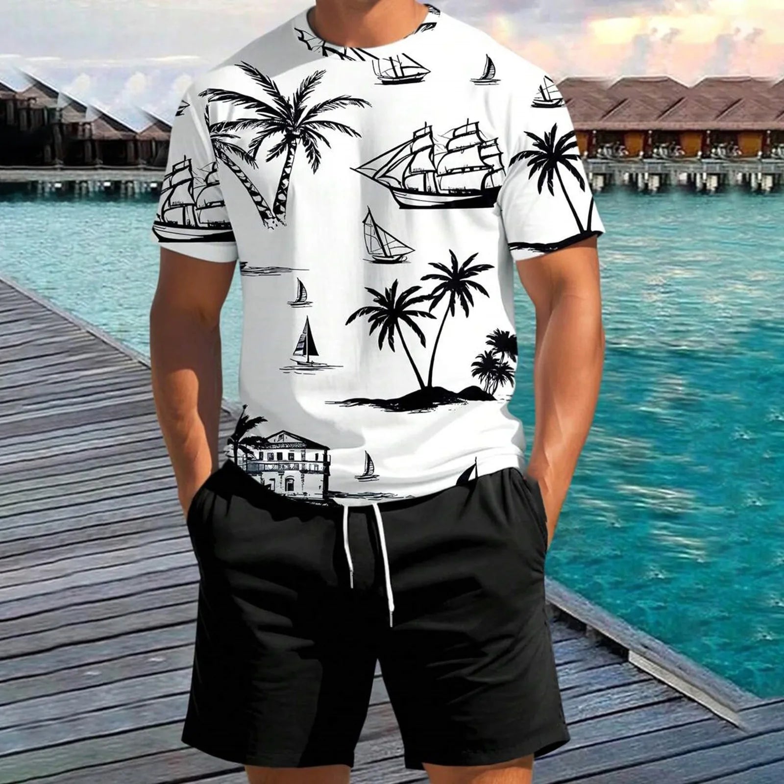 This tropical-print two-piece set brings cool comfort and standout style to your summer lineup, featuring a soft cotton-blend tee and drawstring shorts made for sunny days. The bold coastal motifs and relaxed fit make it an easy go-to for everything from backyard barbecues to beachside hangs.